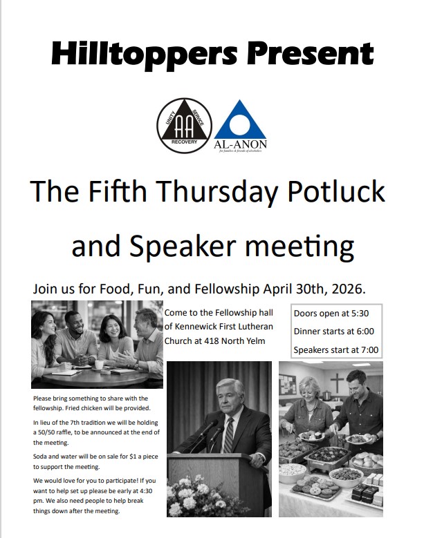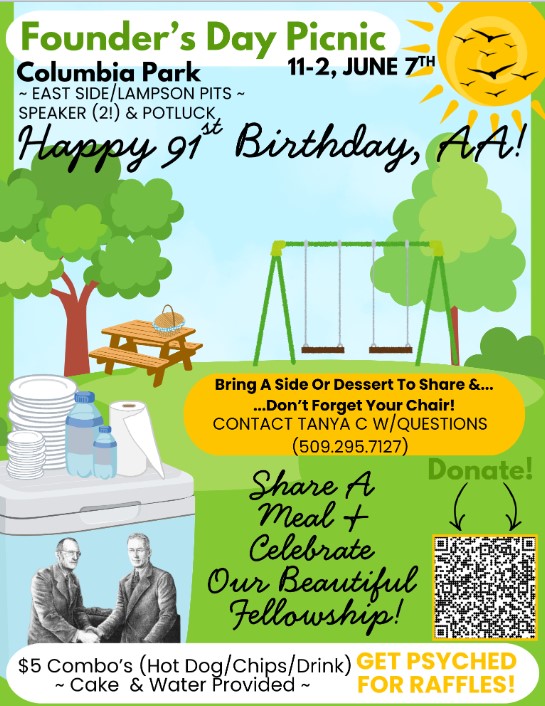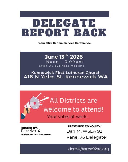 (Note: General guidelines for posting flyers or events are: (1) they are AA meeting; or (2) they have an AA speaker at the function, or (3) they are an AA business activity. This is to comply with the AA Tradition 6 — “An A.A. group ought never endorse, finance, or lend the A.A. name to any related facility or outside enterprise, lest problems of money, property, and prestige divert us from our primary purpose.”)